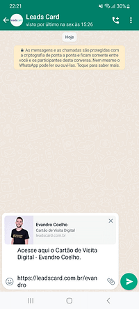 Além de compartilhar o seu cartão de visita por meio do QR Code ou NFC (aproximação) do seu dispositivo eletrônico, é muito útil ter salvo em seu celular o link do perfil virtual. Dessa forma, será possível enviar por WhatsApp, e-mail ou até mesmo via QR Code, quando o dispositivo físico não estiver disponível.