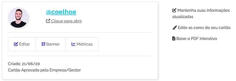 Você encontrará opções como editar informações, tema, baixar um banner e excluir seu cartão. Sempre utilize nossa plataforma e mantenha seu cartão atualizado.